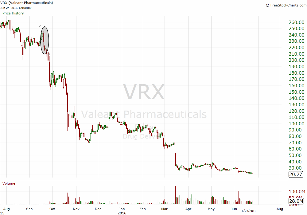 However, mistakes do happen as well. Below, you can check the example of the Valeant Pharmaceuticals Company (VRX). News about a poor condition of the company was published on 21st October 2015 when company shares value was equal to $240. The same day, the session ended with the value being $229. Within a week, it plummeted to $160 only to reach $70 after a month. Currently, company shares are worth 20 dollars.